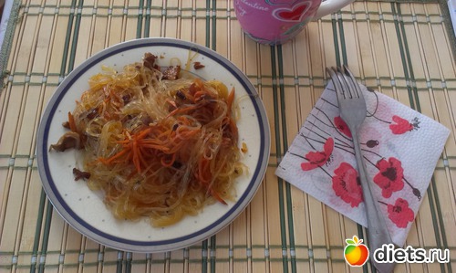 Обед: фунчоза...(морковь по корейски...чеснок...грибы вешенки...немного лучка...соевый соус...капля масла..) и зелёный чай...