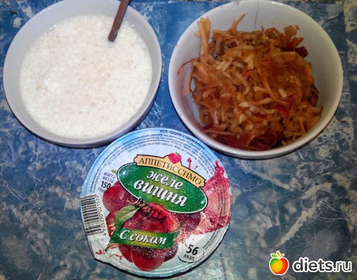 Яблоко, натертое на терке. Творог с сахаром и ряженкой. И покупное желе. Оно не впечатлило. Вкус невнятный.