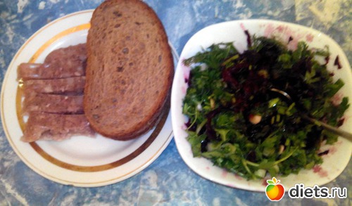 Салат из отварной свеклы с зеленью и чайной ложкой масла. Хлеб и студень промышленного производства. Он оказался низкокалорийным и неплохим на вкус.