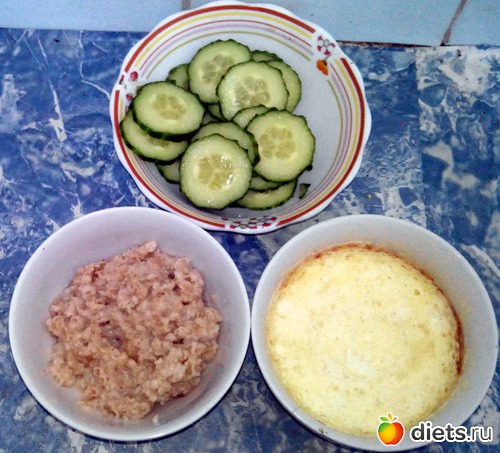 Геркулес на воде, яично-творожная запеканка и немного огурца.