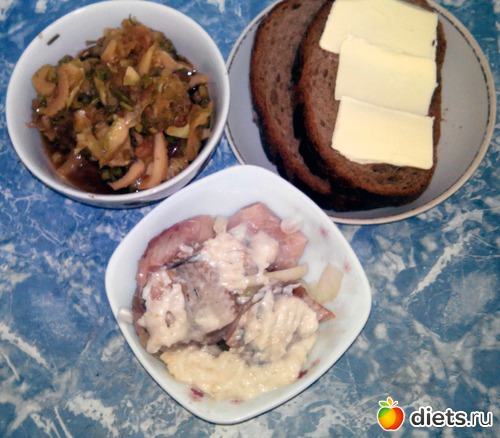 Салат, селедка с луком и хлеб. Один кусочек с маслом - это для селедки. Но зря я это делал. Показалось слишком жирно. Второй кусочек для салата.