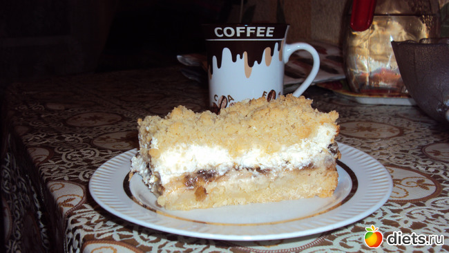 2/3 крошки высыпала в большой противень, сверху сливовую массу, на неё творог и присыпать всё оставшейся крошкой. Поставить в разогретую духовку.