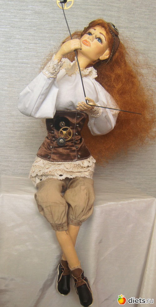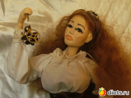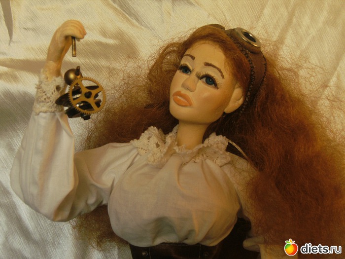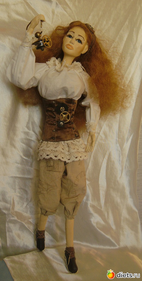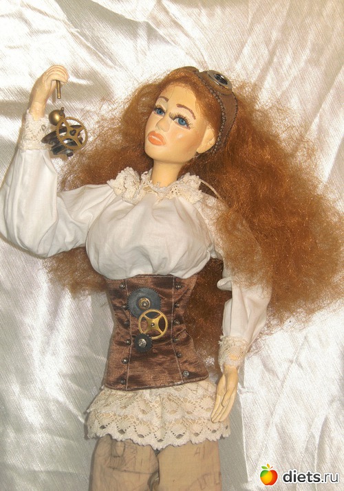 А теперь поподробнее...слепила я голову кукле, сделала тело, пошила рубашечку беленькую с винтажным кружевом, корсетик и приступила к юбочке, чтобы одеть свою пастушку, но тут пришла доча со школы и говорит мол, сделай куклу в стиле стимпанк, тем более одежда подходящая, только вместо юбочки надо штанишки и все такое.