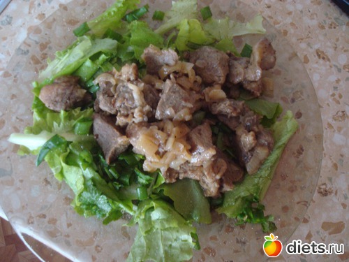 На обед тушеное мяско с луком и семенами кинзы, листья салата зелень