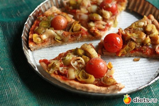 Замесить дрожжевое тесто. Оставить подходить, за это время приготовить начинку. Для начинки белую часть стеблей лука-порея (она более нежная, чем зелёная) нарезать кусками шириной в 1 сантиметр, потушить почти до готовности на сковороде под крышкой, посолить, приправить и охладить. При желании добавить к порею нарезанный небольшими кусками болгарский перец и другие овощи по вкусу. Отдельно приготовить соус – консервированные помидоры потушить до испарения лишней жидкости, добавить приправы, немного соли, измельчить и потушить. Тесто раскатать тонким слоем, выложить в круглую широкую форму, сформировав низкие бортики. На тесто выложить соус, а сверху – тушёные овощи. Распределить сверху, немного «закопав» в начинку, помидоры-черри. Запекать при 200 градусах в течение 20-25 минут.