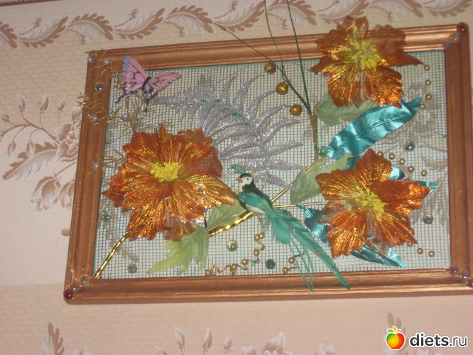 К рамке крепим сетку ( я использовала сетку для цветом, а можно взять сетку для шпаклевки и ее покрасить краской) сетку закрепляем штапиками. Затем с помощью клеевого пистолета крепим искусственные цветы, веточки, бабочки, птички, камни. И картина готова. Смотрится на стене очень красиво и под любые обои. Читать полностью