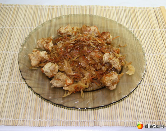 На обед и ужин тушеная индейка с капустой. Пока отмывала сына от каши, капуста немного пережарилась. Но всё равно было вкусно.