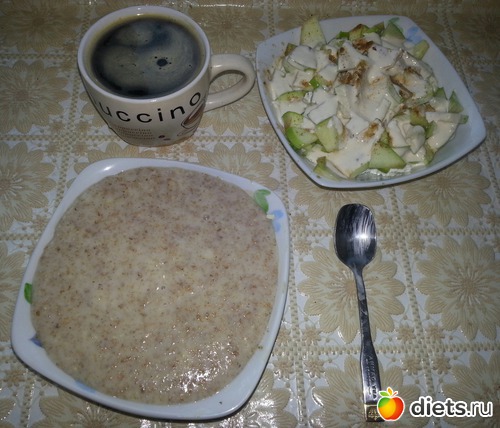 Завтрак - моя любимая кашка из ржаных хлопьев с плавленым сырочком (очень вкусная) и творог с яблоком, ряженкой и немного корицы. Кофе.