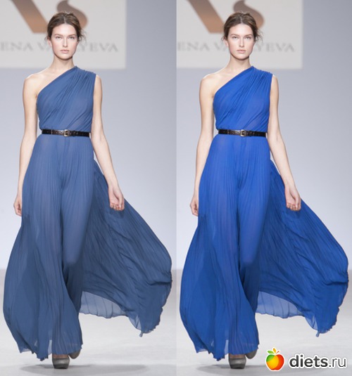 Про любой цвет, даже изначально холодный, можно сказать «этот оттенок теплее другого». Посмотрите на эти 2 синих платья, платье слева холоднее из-за серого пигмента: