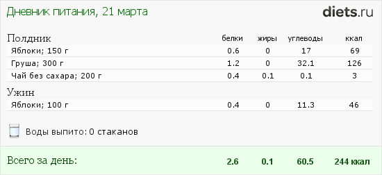 Сегодня мне делали гистероскопию и делали её натощак, нельзя было даже воды попить с утра... жесть... без утреннего кофе я не человек... а еще пришлось пеликать в другой город 3часа... у нас её не делают... ну и вот к 14часам можно было и поесть. и попить, но уже не очень то хотелось... вот я и решила пусть будет разгрузочный день... всё же польза... схомячила две груши и два яблока, ну, и чай стаканчик выпила, а вот сырой воды почему-то совсем не хочется пить, хотя вроде бы нужно, но не заставлять же себя силком.. итак: