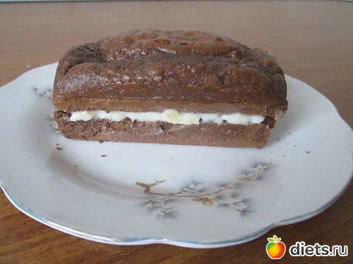 Вторую охладила, разрезала на 2 части и промазала ванильным пудингом