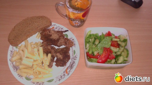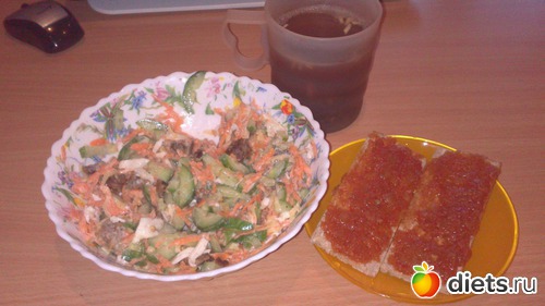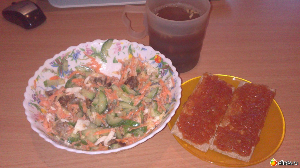 Ужин: витаминно-белковый салат, сама придумала, из ого что было в холодильнике. 2 хлебца с аджикой