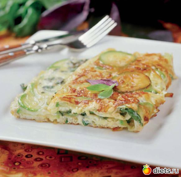 2) Обжарить кабачок до мягкости. Яйца взболтать с солью и зеленью и залить смесью кабачки.
