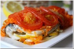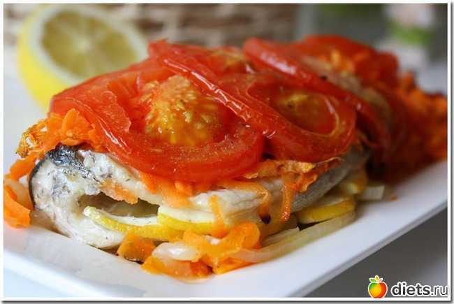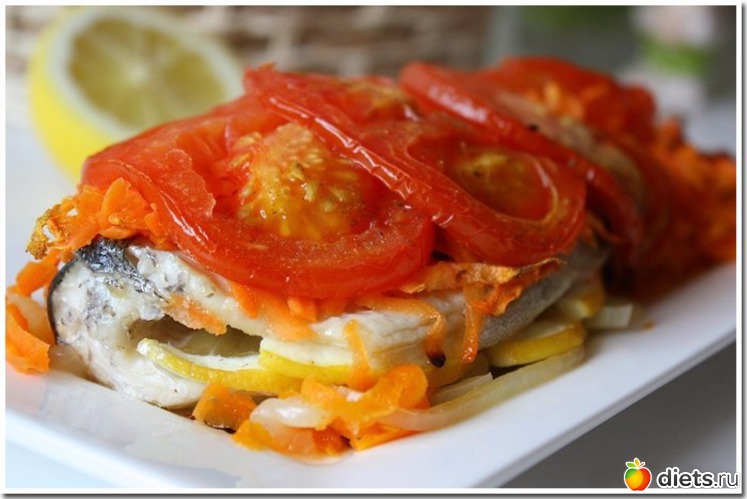 Натереть рыбу специями. Выложить на фольгу, сверху положить лук, морковь, томат. Завернуть и выпекать 30-40 минут при 190С. Читать полностью