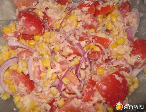 Салат из помидоров с тунцом Хороший салатик, не банальный, и с интересным вкусом: помидоры, тунец, кукуруза и лук. Низкокалорийный и это хорошо. Единственный недостаток - его надо есть сразу после приготовления, потому как помидоры быстро выделяют сок.