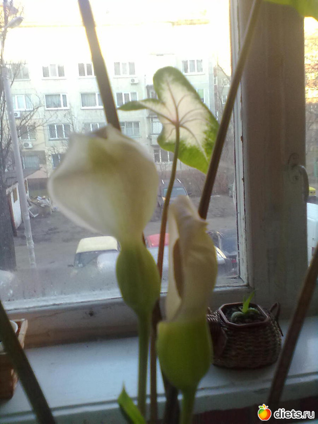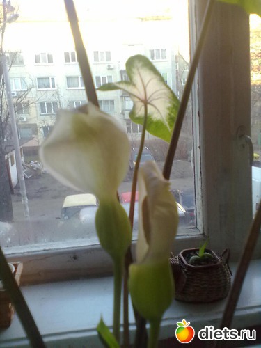 Каладиум цветет! Клубни каладиума двухцветного привезла мне подруга из США четыре года назад. Это растение ценится за красивую "расписную" окраску листьев. У него ярко выраженный период покоя. Клубни прекрасно зимуют в сухом торфе, а в феврале, когда проклевываются глазки, я пересаживаю клубни в свежую землю глазками вверх и начинаю поливать. В этом году впервые я увидела как каладиум цветет - цветение напоминает спатифиллум, тоже колосок с белым покрывалом. Когда я сообщила об этом событии подруге, она сказала, что стрелки всегда вырезает, потому что цветение ослабляет листья и клубни. Я тоже срезала, но сначала сфотографировала, хотя бы на телефон. Правда, фоток всего две, но я решила все же создать альбом и, может быть, в дальнейшем пополнять его.