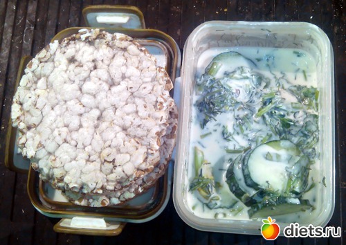 Что-то вроде салата из огурца, зелени и ряженки. Плюс два слайса.