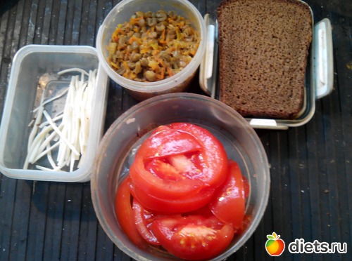 Помидорка, чечевица с овощами, хлеб и сыр.