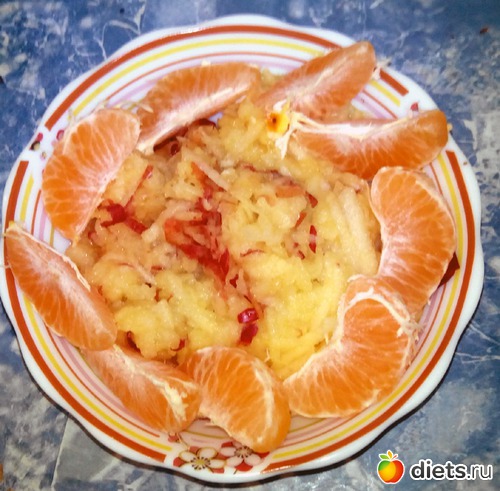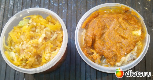 Салат из тыквы, яблока и редьки. Овсянка, грудка и соус из тыквы.