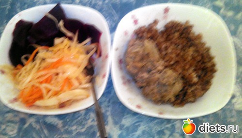 Отварная свекла, закуска из капусты, гречка и фрикадельки из куриного фарша с луком.