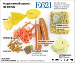 Химический глутамат натрия (пищевая добавка Е621- белый кристаллический порошок, хорошо растворимый в воде) обладает способностью усиливать вкус и аромат блюд. Для производителей пищевой промышленности глутамат натрия (пищевая добавка Е621) настоящий клад! С ее помощью можно не только придать продуктам «неповторимый вкус», сэкономить на натуральных продуктах, но и «забить» вкус некачественных продуктов, используемых в приготовлении, что приводит к повышению продаж.