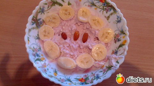 Перекус: творог с черничным йогуртом, 1/2 банана, 3 миндаля