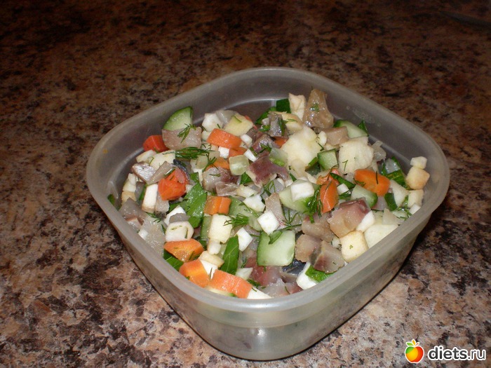 ): морковь, свежий огурец, сельдерей, яблоко, филе сельди и зелень. Заправлю утром горчичным маслом.
