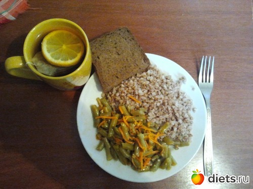 Обед - гречка+салат из стручковой фасоли и моркови по-корейски+хлеб+чай с лимоном