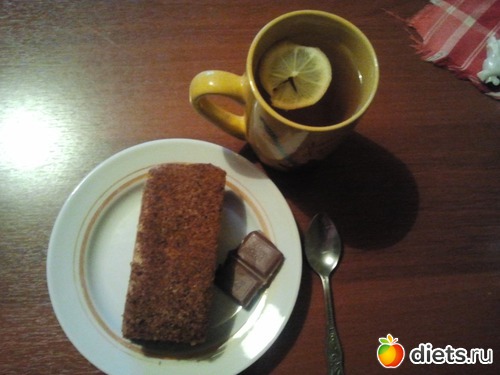 Ужин - пирожное "Медовик"+шоколад молочный (горького у мамы не было)+чай с лимоном