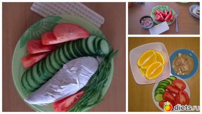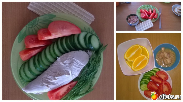 Ужин: Половина банки тунца, помидоры, огурцы и апельсин.