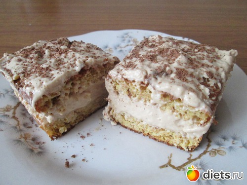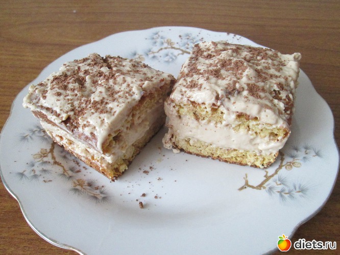 Бисквит разрезать на 2 коржа. Нижнюю половину уложить в форму, свержу выложить 90% крема и накрыть вторым коржом, Обмазать его сверху, можно посыпать корицей, как у меня. Поставить в холодильник на 30 мин- 1 час, чтобы крем застыл.