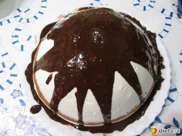 Корж разрезаем на 2 части. Торт будет перевертыш. Выкладываем половину крема, затем корж, вторую половину крема. опять корж. Ставим в холодильник для застывания на несколько часов. Достаем переворачиваем на тарелку, снимаем пленку. Сверху можно полить глазурью, затем поставить в холодильник еще на пару часов.