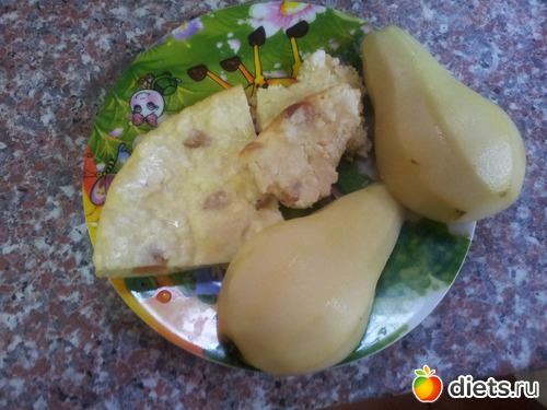 Творожная запеканка с изюмом, творог делала сама, жирность не знаю поэтому взяла максимальную. Запеканку делала мама поэтому точное кол-во ингридиентов я не знаю считала на глаз.