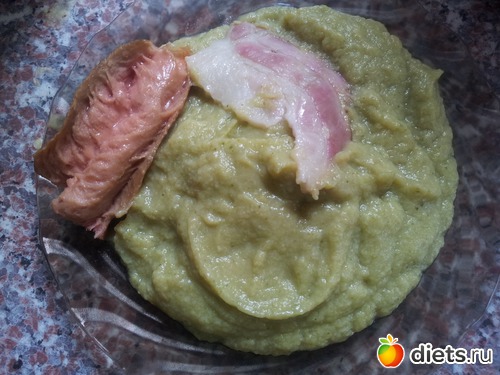 Обед кабачки сварила на пару потом блендером. Сосиска и кусочек грудинки слоенной. Знаю что вредно но ничего другого не было. У нас метель дороги перемело гололед никуда не поехала в магазин.