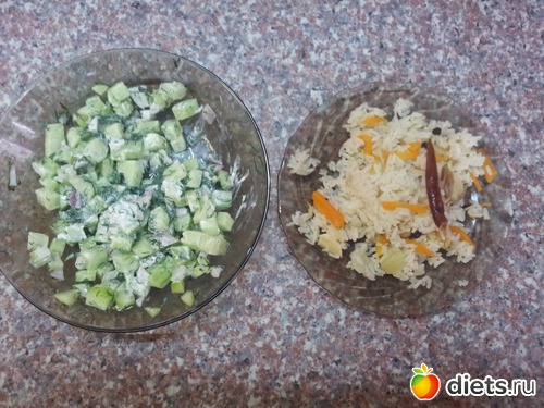 Ужин салатик огурчики, красный лук, сметанка и зелень (укроп). Рис с морковкой, луком, чесноком, В дневнике написала просто рис (по максимуму). Аааа еще пару фиников с чаем съела