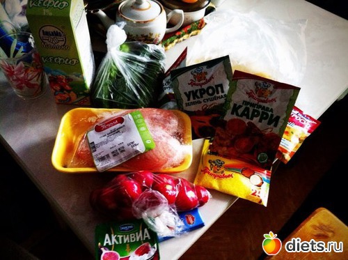 Кокосовая стружка, карри, укроп, активиа, кефир, бананы, редиска, грудка, огурцы, крем-суп(любимого не было, пришлось другой взять)