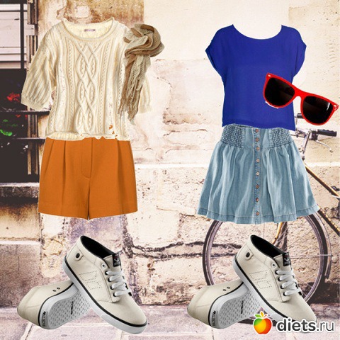 Отлично смотрятся кеды с длинной рубашкой и укороченными брюками. Яркие, к примеру, оранжевые кеды располагают к тому, что этот же цвет должен повториться в образе ещё раз. Этим дополнением может быть обычная оранжевая футболка, или же браслет, обруч, сумка. Такое сочетание можно считать универсальным и подходящим для прогулок по городу или магазинам.