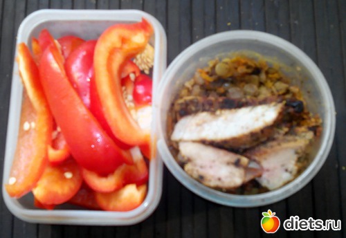 Болгарский перец, чечевица с овощами и запеченное на гриле мясо (стейк из свинины, если кому это интересно).