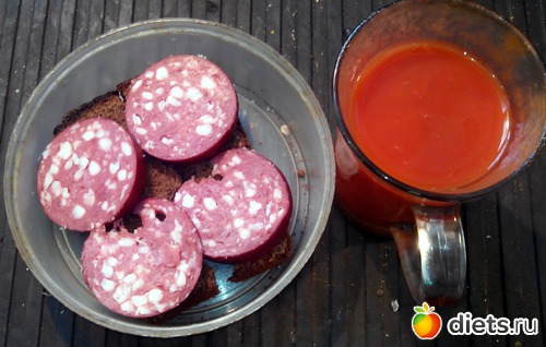 Томатный сок и пара бутеров из хлеба и колбасы.
