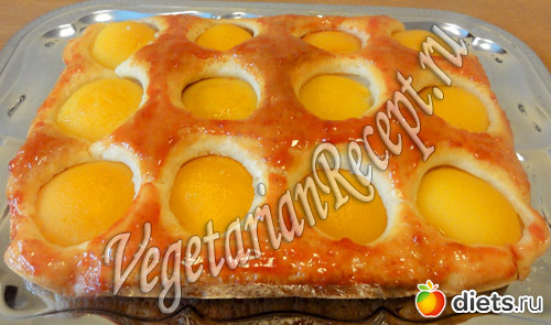 5. Поставить пирог в разогретую духовку и выпекать 30-40 минут до румяной корочки и «сухой спички». Сверху пирог можно еще смазать густом вареньем (лучше абрикосовым) с помощью кондитерской кисточки.