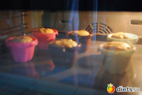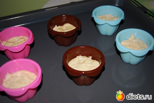 Формочки должны быть заполнены не более, чем на 2/3, т.к. в духовке тесто еще будет подниматься!