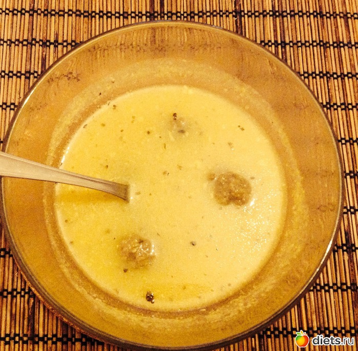На завтрак съела немного супа из тыквы с фрикадельками. Здесь ничего нет, кроме бульона на 1 кубике магги, тыквы, немного сливок 20%.