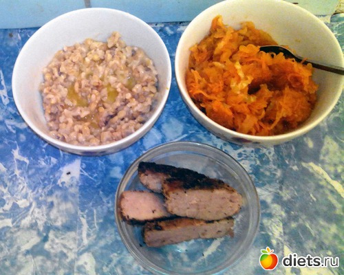 Салат из тыквы... ну и прочего. Овсянка и запеченное мясо. Мясо именно запеченное из старых запасов.