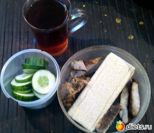 Огурец. Хлебцы и остаток мяса. Чай.