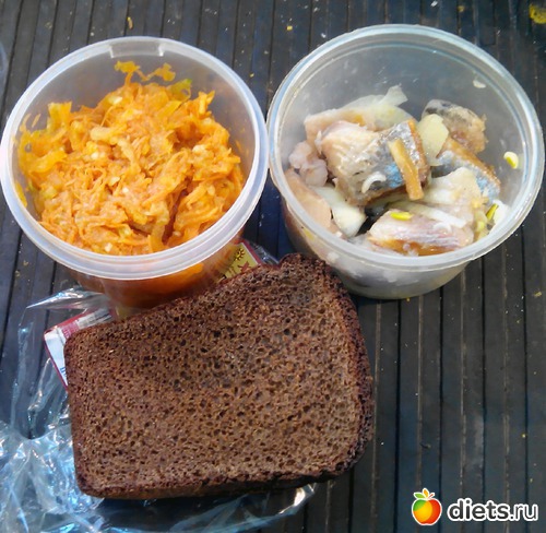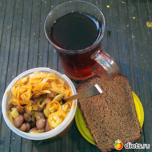 Еще порция салата из тыквы и прочего. Остатки селедки с луком и хлеб. Запивал кипяченой водой. Чаю уже не хотел.