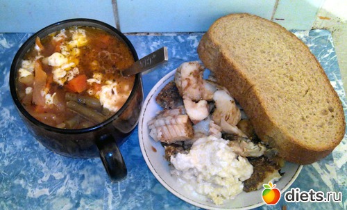 Овощной суп, заправленный козьим чечилом (проще его так было съесть). Запеченная вчера треска и хлеб.