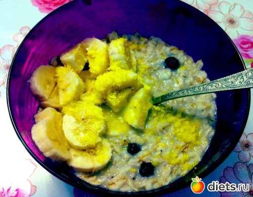 заварная овсянка черничкая+банан+кокосовая стружка+хлебец с плавленым сыром+кофемолоко