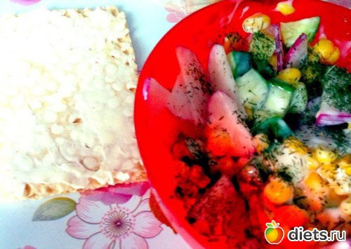 салат(огурец+редиска+кукуруза+натуральный йогурт)+хлебец с плав. сыром+творожная масса+кофемолоко