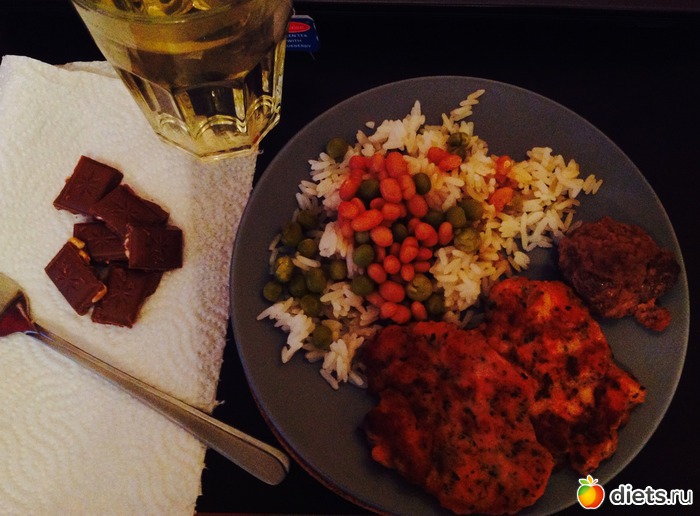 Здесь - 2 рубленных котлетки из лосося с базиликом, 1 котлета на пару из говяжьего фарша и ложкой мюслей, фасоль, горошек, рис, 8 кубиков молочного шоколада с орехом