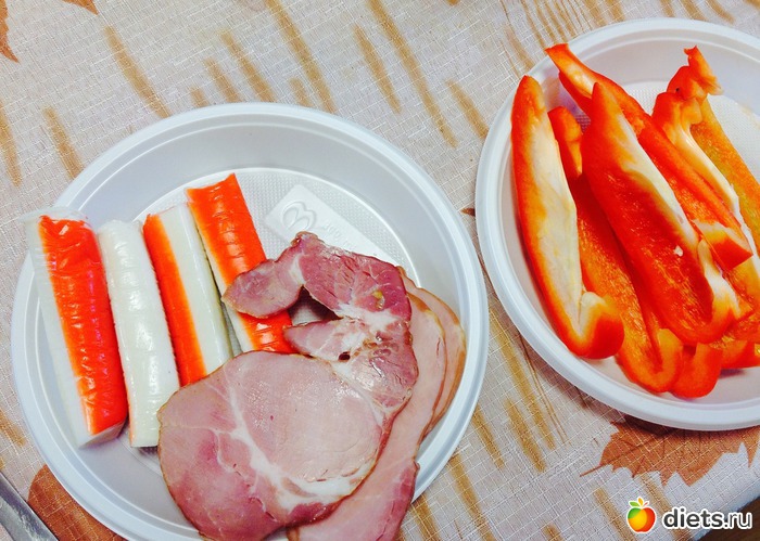 Обедала как приехали - крабовые палочки (на фото 4 шт - 100 гр, как съела добавила еще 4 шт), 3 кусочка нарезного мяска, половина перчика.